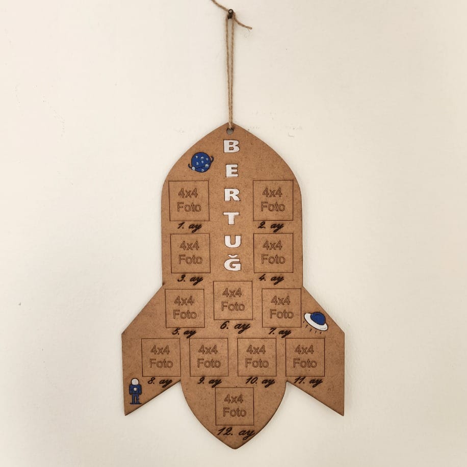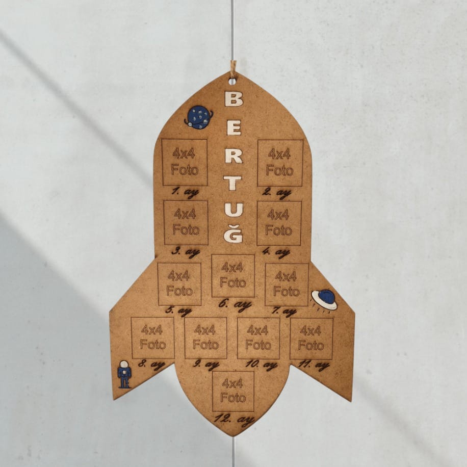 Yeni doğan bebekler için özel olarak tasarlanan bu ahşap tablo, uzay aracı (roket) formuyla dikkat çeker. Bebeğin ismine özel olarak hazırlanır. Doğum hediyesi, bebek odası dekorasyonu ya da uzun yıllar saklanabilecek anlamlı bir hatıra olarak tercih edebilirsin.