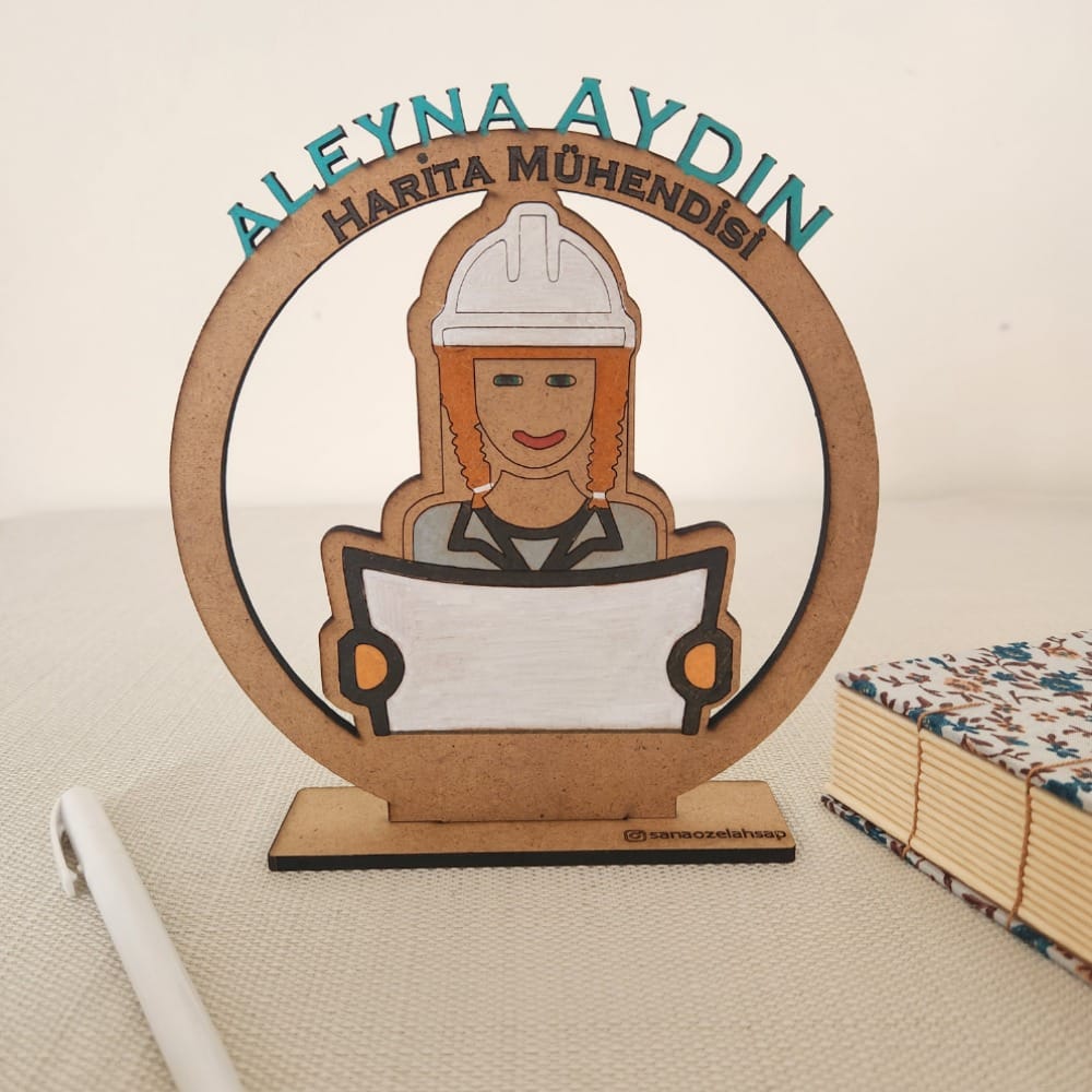 Kadın mühendisler için özel olarak tasarlanmış bu dekoratif biblo, 18×18 cm ölçülerinde ve 4 mm kalınlığında dayanıklı MDF malzeme ile hazırlanmıştır.