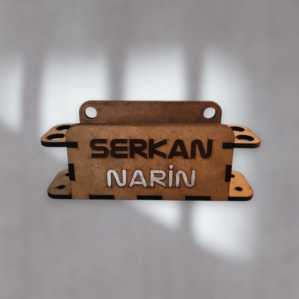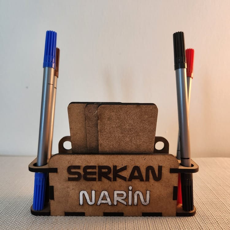 İsme özel hazırlanan bu ahşap kalemlik ve kartlık, ofis masanda ya da ev çalışma alanında düzeni sağlarken sana özel tasarımıyla fark yaratır.