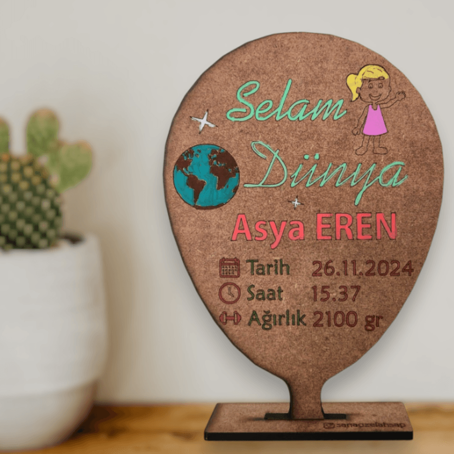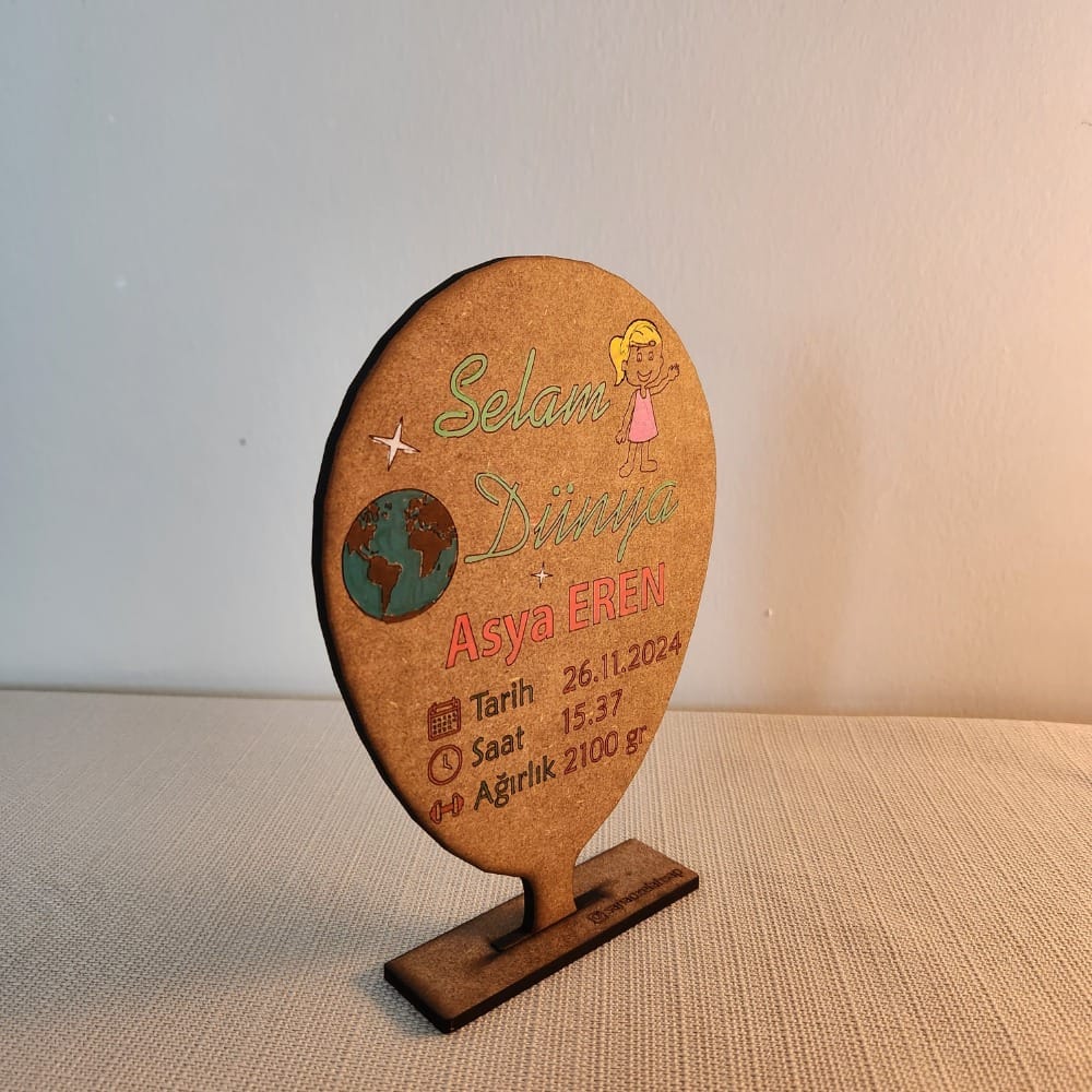 “Selam Dünya” Yeni Doğan Biblo | İsme Özel Tasarım | 19×13,5 cm | 4mm MDF Malzeme